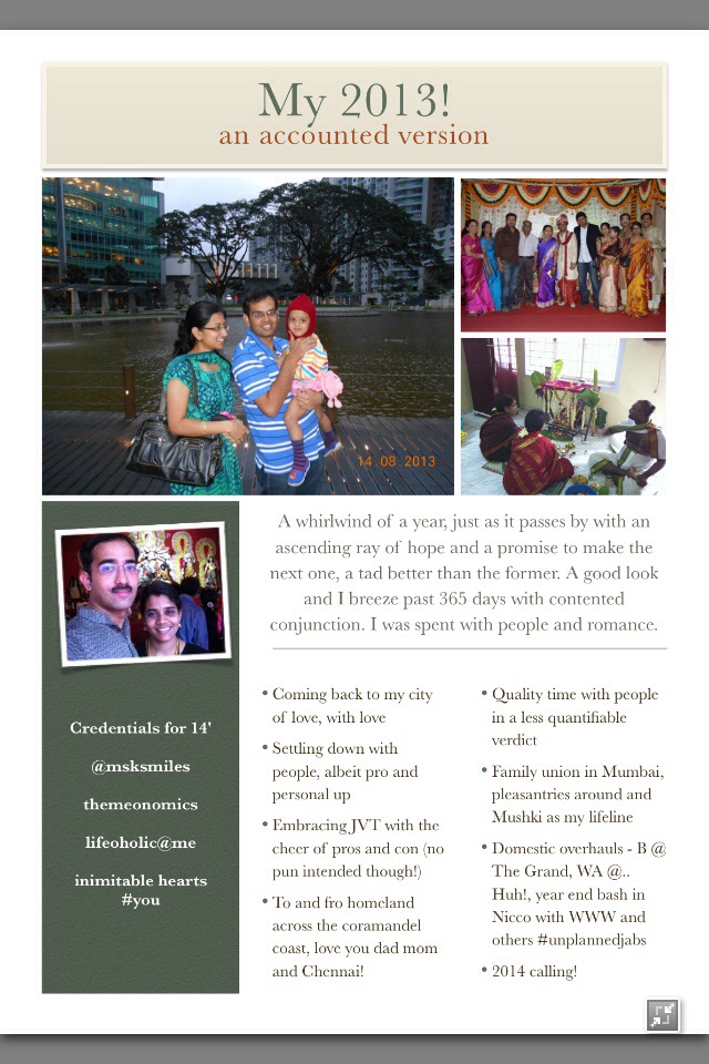 the year that was.. #thankyou2013 Posted byLifeoholicDecember 31, 2013December 31, 2013Posted inInspiration!, life!, love, My Life, Nostalgia, Personal, Travel, various me, wishes!!Tags:2013, adeiu, Life, miss you Share if you loved it! Click to email a link to a friend (Opens in new window) Email Click to print (Opens in new window) Print Click to share on WhatsApp (Opens in new window) WhatsApp Tweet Click to share on Reddit (Opens in new window) Reddit Like Loading... Related Published by Lifeoholic Flamboyance meets me, and I could be contagiously luring. It kind of comes off in my writing, as my stories of passion and indulgence unfold. View more posts