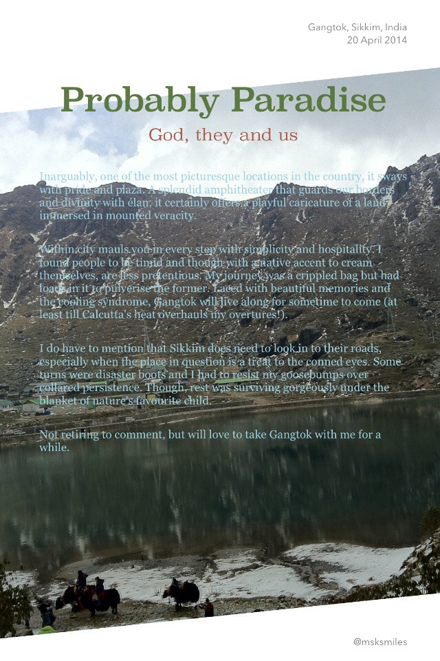 Posted byLifeoholicPosted inFamily, Inspiration!, life!, Personal, poetry, Sarada, Travel, various meTags:Gangtok, Paradise