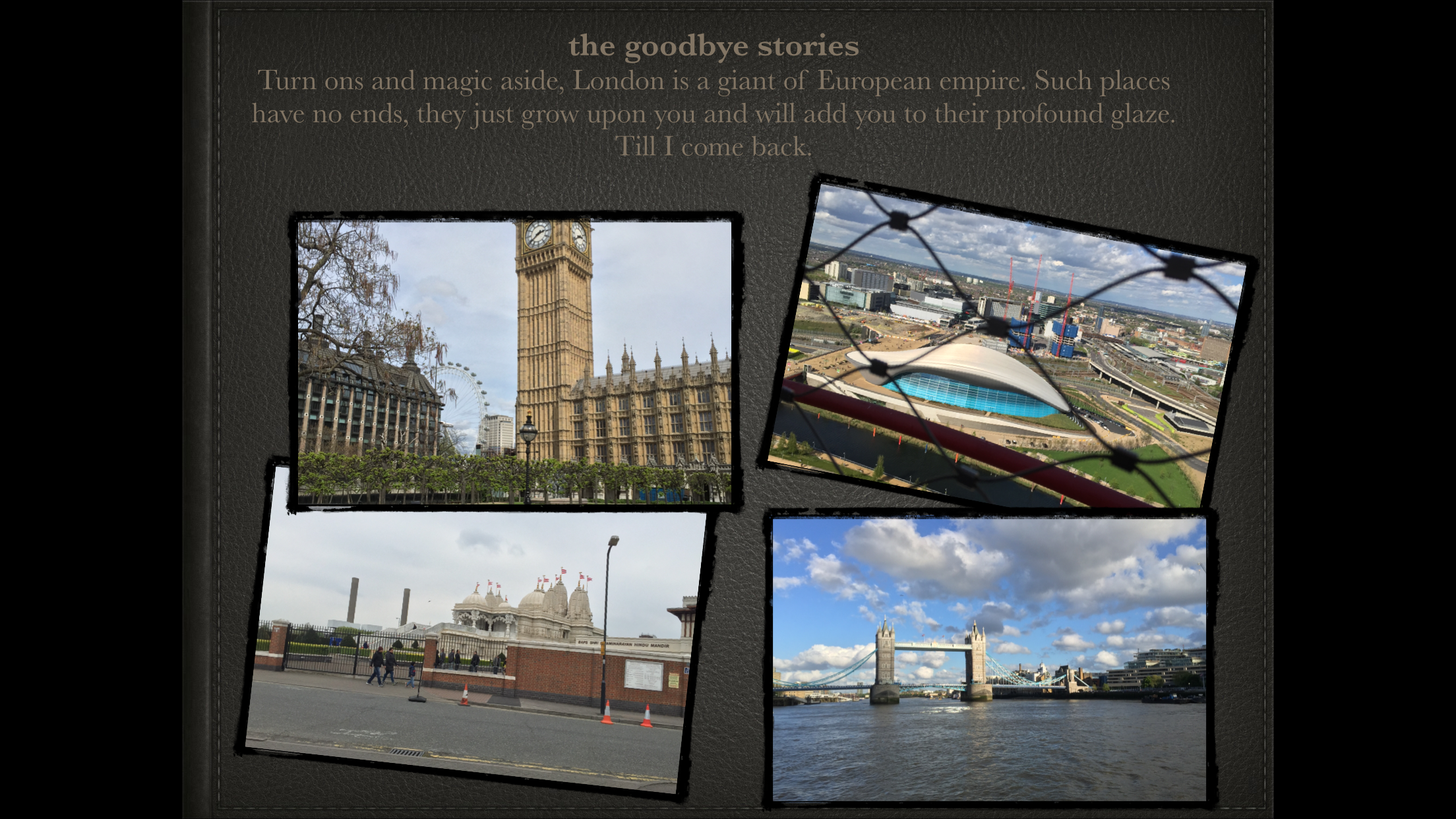 London Diaries Posted byLifeoholicMay 10, 2015May 10, 2015Posted inInspiration!, life!, love, My Life, Personal, poetry, Travel, various meTags:Geater London, London, Sarada, Wembley Share if you loved it! Click to email a link to a friend (Opens in new window) Email Click to print (Opens in new window) Print Click to share on WhatsApp (Opens in new window) WhatsApp Tweet Click to share on Reddit (Opens in new window) Reddit Like Loading... Related Published by Lifeoholic Flamboyance meets me, and I could be contagiously luring. It kind of comes off in my writing, as my stories of passion and indulgence unfold. View more posts