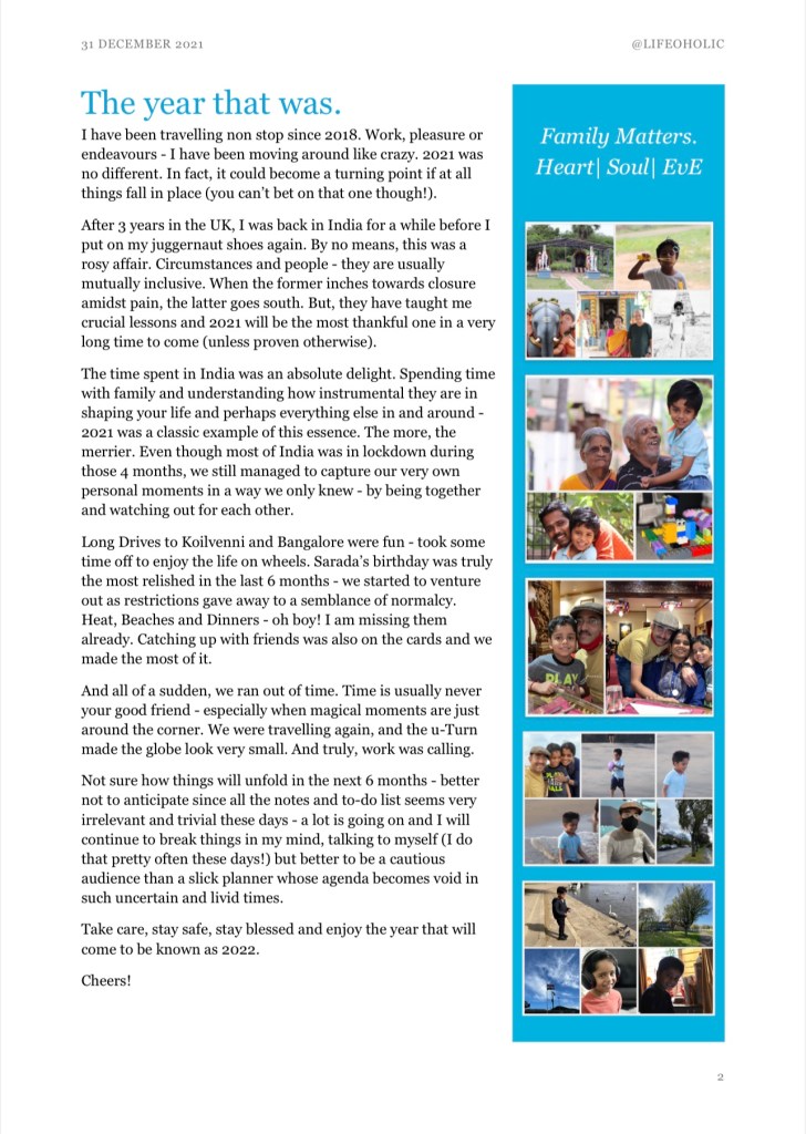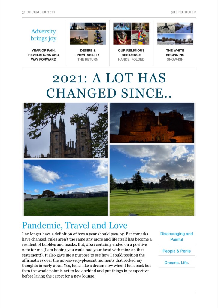 @2021 – The Year End Report Posted byLifeoholicDecember 31, 2021December 31, 2021Posted inInspiration, Photography, Quotes, The Lifeoholic Diaries, Travel, TributeTags:2021, 2022 ๐2021 ๐โโ๏ธ2022 ๐2021 ๐โโ๏ธ2022 Share if you loved it! Click to email a link to a friend (Opens in new window) Email Click to print (Opens in new window) Print Click to share on WhatsApp (Opens in new window) WhatsApp Tweet Click to share on Reddit (Opens in new window) Reddit Like Loading... Related Published by Lifeoholic Flamboyance meets me, and I could be contagiously luring. It kind of comes off in my writing, as my stories of passion and indulgence unfold. View more posts
